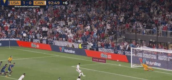 点球大战中,第一轮两队都射失点球;第二轮,加拿大队射丢点球;第三轮和第四轮两队都罚进;第五轮,加拿大队再射失点球!美国队点球大战3-2胜出,总比分5-4晋级四强赛。
