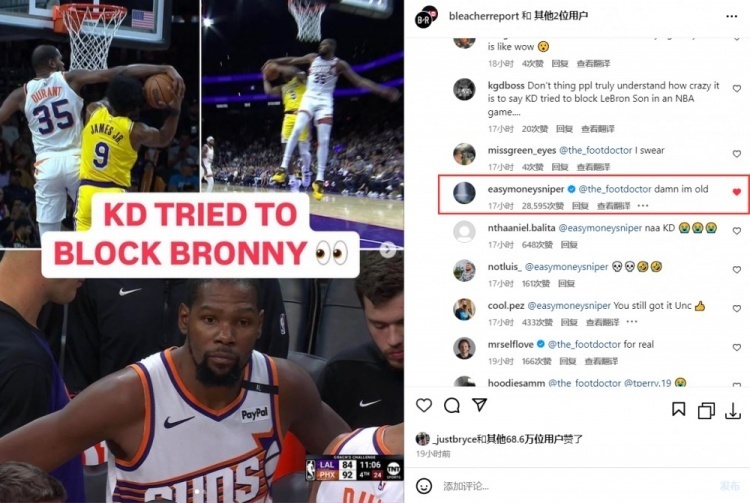 一位网友评论道:“杜兰特在一场NBA比赛中封盖詹姆斯的儿子,听起来真是太疯狂了...”