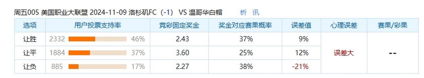 本场比赛中,选择洛杉矶FC让球负的球迷偏少了,只有17%的球迷选择让球负选项,这场比赛中,大家都看好洛杉矶FC会能够直接大胜赢得这场比赛,不看好温哥华白帽能在客场保住自己底线,但是这也与奖金对应赛果概率的38%相差了21%。
